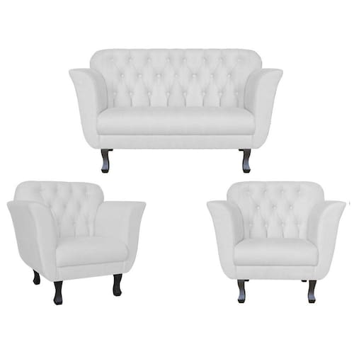 Kit Namoradeira + 2 Poltronas Decorativa Dália Couro Branco Pés Madeira Ms Decor