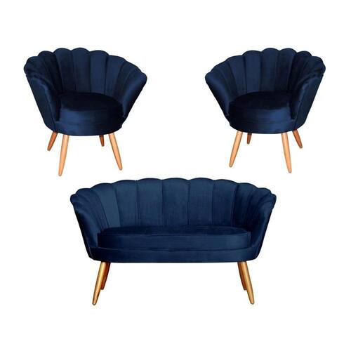Kit Namoradeira + 2 Poltronas Decorativa Pétala Veludo Azul Marinho Pés Madeira Ms Decor