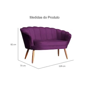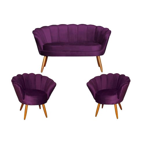 Kit Namoradeira + 2 Poltronas Decorativa Pétala Veludo Roxo Pés Madeira Mz Decor
