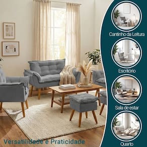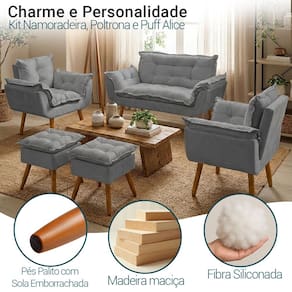 Fabricado com madeira maciça de eucalipto, o Kit Alice garante durabilidade e resistência. O assento e encosto possuem enchimento em fibra mista, proporcionando maciez e conforto excepcionais. Revestido em tecido suede, oferece um toque macio e sofisticado. Seus pés, em madeira na tonalidade castanho, possuem design moderno e estável, trazendo charme e elegância ao ambiente. Com capacidade para até 120 kg na poltrona e namoradeira, e 90 kg no puff, é a escolha ideal para quem busca qualidade, conforto e estilo.