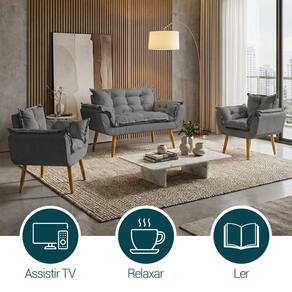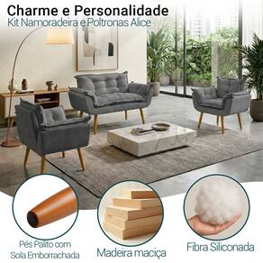 Kit Namoradeira Decorativa E 2 Poltronas Confortável Para Sala Recepção Manicure Consultório Escritório Alice Tecido Suede - Cinza