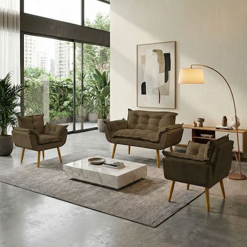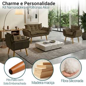 Kit Namoradeira Decorativa E 2 Poltronas Confortável Para Sala Recepção Manicure Consultório Escritório Alice Tecido Suede - Marrom Escuro