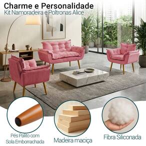 Eleve o charme e o conforto do seu ambiente com o Kit Namoradeira + 2 Poltronas Alice, um conjunto sofisticado e versátil, ideal para salas de estar, escritórios, recepções e consultórios. Com um design elegante e acolhedor, adapta-se perfeitamente a diferentes estilos de decoração, combinando funcionalidade e requinte em cada detalhe.