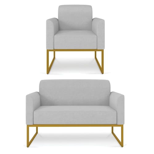 O momento em que decidimos mobiliar nossa casa é um evento muito especial, pois representa o que gostamos e o que irá refletir através dos móveis que irão compor cada espaço do nosso Lar.Cada escolha é uma oportunidade de imprimir o que sentimos, e para Sala de Estar desejamos conforto e beleza, para a hora de um bate-papo ou um belo café da tarde. O Kit Namoradeira e 1 Poltrona Decorativa Base Industrial Dourada Maressa A05 Linho Cinza Claro - Ibiza pode transformar seu ambiente em algo único, sua estrutura em metal é firme e com fino acabamento, o estofado é macio e traz a leveza que o Estilo Industrial pode fazer em sua essência.Faça uma escolha inteligente e adquira conosco este Conjunto de Poltrona Namoradeira e Poltrona Decorativa, um toque de classe para o seu cantinho favorito.EspecificaçõesDimensões do Produto(Largura x Altura x Profundidade):Namoradeira: 113 x 76 x 64 cm.Poltrona: 65 x 77 x 64 cm.Peso: 33 kg.Outras MedidasProfundidade do assento: 46 cm.Largura do assento: 95 cm.Altura do assento ao chão: 44 cm.Altura do encosto: 35 cm.Altura Interna do Braço: 18 cm.Altura dos pés: 30 cm.Características do ProdutoMaterial da Estrutura: Madeira reflorestada de Eucalipto..Material da Espuma: Espuma D-28 no assento e encosto e D-23 nos braços..Peso Suportado: Até 360 Kg.Revestimento: Linho.Tipo de Encosto: Fixo.Tipo de Assento: Fixo.Quantidade de Lugares: 3 Lugares.Possui Pés: Sim.Material dos Pés: Base Industrial.Diferenciais:- Design moderno.- Percintas elásticas no assento.Sistema de Montagem: O produto é enviado montado, sendo necessário apenas fixar a base.Volumes: 3 Volumes.Conteúdo da Embalagem: 1 Namoradeira e 1 Poltrona Decorativa.Garantia do Fabricante: 90 dias contra defeito de fabricação.Montagem: Recomendamos que seja feita por um profissional.Recomendação de Limpeza: Utilize pano levemente úmido.Observações importantes:- Produto para uso residencial em ambiente interno, não devendo ficar exposto diretamente ao sol, calor e umidades excessivas.- Pode haver alguma diferença de tonalidade entre a imagem e o produto real, por conta do tratamento de imagens e a calibração de cores do seu monitor.- As imagens são meramente ilustrativas, não acompanham objetos de decoração e eletrônicos.- Confira o estado da embalagem, não devendo assinar o comprovante em caso de danos.- Não asseguramos, no ato da entrega, por subir escadas/elevadores, pelo transporte por guincho em apartamentos ou montagem, desmontagem e instalações. Eventuais despesas são por conta do comprador.- Confira as dimensões do produto e certifique-se de que passará normalmente por supostos elevadores, portas, escadas e/ou corredores de sua residência.