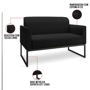 O momento em que decidimos mobiliar nossa casa é um evento muito especial, pois representa o que gostamos e o que irá refletir através dos móveis que irão compor cada espaço do nosso Lar.Cada escolha é uma oportunidade de imprimir o que sentimos, e para Sala de Estar desejamos conforto e beleza, para a hora de um bate-papo ou um belo café da tarde. O Kit Namoradeira e 1 Poltrona Decorativa Base Industrial Preta Maressa A79 Linho Preto - Ibiza pode transformar seu ambiente em algo único, sua estrutura em metal é firme e com fino acabamento, o estofado é macio e traz a leveza que o Estilo Industrial pode fazer em sua essência.Faça uma escolha inteligente e adquira conosco este Conjunto de Poltrona Namoradeira e Poltrona Decorativa, um toque de classe para o seu cantinho favorito.EspecificaçõesDimensões do Produto(Largura x Altura x Profundidade):Namoradeira: 113 x 76 x 64 cm.Poltrona: 65 x 77 x 64 cm.Peso: 33 kg.Outras MedidasProfundidade do assento: 46 cm.Largura do assento: 95 cm.Altura do assento ao chão: 44 cm.Altura do encosto: 35 cm.Altura Interna do Braço: 18 cm.Altura dos pés: 30 cm.Características do ProdutoMaterial da Estrutura: Madeira reflorestada de Eucalipto..Material da Espuma: Espuma D-28 no assento e encosto e D-23 nos braços..Peso Suportado: Até 360 Kg.Revestimento: Linho.Tipo de Encosto: Fixo.Tipo de Assento: Fixo.Quantidade de Lugares: 3 Lugares.Possui Pés: Sim.Material dos Pés: Base Industrial.Diferenciais:- Design moderno.- Percintas elásticas no assento.Sistema de Montagem: O produto é enviado montado, sendo necessário apenas fixar a base.Volumes: 3 Volumes.Conteúdo da Embalagem: 1 Namoradeira e 1 Poltrona Decorativa.Garantia do Fabricante: 90 dias contra defeito de fabricação.Montagem: Recomendamos que seja feita por um profissional.Recomendação de Limpeza: Utilize pano levemente úmido.Observações importantes:- Produto para uso residencial em ambiente interno, não devendo ficar exposto diretamente ao sol, calor e umidades excessivas.- Pode haver alguma diferença de tonalidade entre a imagem e o produto real, por conta do tratamento de imagens e a calibração de cores do seu monitor.- As imagens são meramente ilustrativas, não acompanham objetos de decoração e eletrônicos.- Confira o estado da embalagem, não devendo assinar o comprovante em caso de danos.- Não asseguramos, no ato da entrega, por subir escadas/elevadores, pelo transporte por guincho em apartamentos ou montagem, desmontagem e instalações. Eventuais despesas são por conta do comprador.- Confira as dimensões do produto e certifique-se de que passará normalmente por supostos elevadores, portas, escadas e/ou corredores de sua residência.