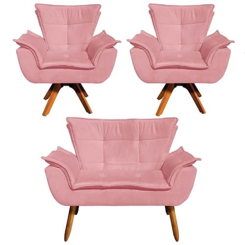 Altura: 91 cm | AssemblyRequired: Sim, sugerimos a contratação do nosso serviço de montagem (para os CEPs em que o serviço está dispon | Color: Rosê | ColorFamily: Rosê | ColorSimple: Rosê | ColorSupplier: Rose | Cor: Rosê | Gênero: Unisex | Largura: 128 cm | Manual: Sim | Marca: Ibiza | Material: Madeira de Eucalipto | MaterialFamily: Madeira de Eucalipto | Model: Opla | Origem: | OriginCountry: | OriginState: PR | Peso: 64 kg | Peso Suportado: 120 kg | ProductContents: 1 Namoradeira, 2 Poltronas | ProductHeight: 91 | ProductInstructions: Produto para uso em ambiente interno, nao devendo ficar exposto ao sol, calor e umidade excessivos. | ProductLength: 62 | ProductWarranty: 90 dias após o do produto | ProductWeight: 64 | ProductWidth: 128 | Profundidade: 62 cm | Requere montagem: Sim | SizeDescription: 91 x 128 x 62 cm | SupplierSimpleName: Kit Namoradeira e 2 Poltronas Base Giratória Madeira Opla Suede Rose - Ibiza | Tipo de : Fabricante