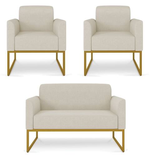 Kit Namoradeira e 2 Poltronas Decorativas Base Industrial Dourada Maressa A19 Linho Grosso Bege - Ibiza