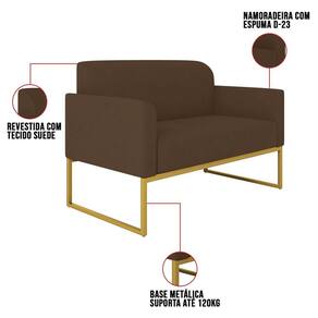 O momento em que decidimos mobiliar nossa casa é um evento muito especial, pois representa o que gostamos e o que irá refletir através dos móveis que irão compor cada espaço do nosso Lar.Cada escolha é uma oportunidade de imprimir o que sentimos, e para Sala de Estar desejamos conforto e beleza, para a hora de um bate-papo ou um belo café da tarde. O Kit Namoradeira e 2 Poltronas Decorativas Base Industrial Dourada Maressa S06 Suede Marrom - Ibiza pode transformar seu ambiente em algo único, sua estrutura em metal é firme e com fino acabamento, o estofado é macio e traz a leveza que o Estilo Industrial pode fazer em sua essência.Faça uma escolha inteligente e adquira conosco este Conjunto de Poltrona Namoradeira e Poltrona Decorativa, um toque de classe para o seu cantinho favorito.EspecificaçõesDimensões do Produto (Largura x Altura x Profundidade):Namoradeira: 113 x 76 x 64 cm.Poltronas: 65 x 77 x 64 cm.Peso: 46 kg.Outras MedidasProfundidade do assento: 46 cm.Largura do assento: 95 cm.Altura do assento ao chão: 44 cm.Altura do encosto: 35 cm.Altura Interna do Braço: 18 cm.Altura dos pés: 30 cm.Características do ProdutoMaterial da Estrutura: Madeira reflorestada de Eucalipto..Material da Espuma: Espuma D-28 no assento e encosto e D-23 nos braços..Peso Suportado: Até 480 Kg.Revestimento: Suede.Tipo de Encosto: Fixo.Tipo de Assento: Fixo.Quantidade de Lugares: 4 Lugares.Possui Pés: Sim.Material dos Pés: Base Industrial.Diferenciais:- Design moderno.- Percintas elásticas no assento.Sistema de Montagem: O produto é enviado montado, sendo necessário apenas fixar a base.Volumes: 4 Volumes.Conteúdo da Embalagem: 1 Namoradeira e 2 Poltronas Decorativas.Garantia do Fabricante: 90 dias contra defeito de fabricação.Montagem: Recomendamos que seja feita por um profissional.Recomendação de Limpeza: Utilize pano levemente úmido.Observações importantes:- Produto para uso residencial em ambiente interno, não devendo ficar exposto diretamente ao sol, calor e umidades excessivas.- Pode haver alguma diferença de tonalidade entre a imagem e o produto real, por conta do tratamento de imagens e a calibração de cores do seu monitor.- As imagens são meramente ilustrativas, não acompanham objetos de decoração e eletrônicos.- Confira o estado da embalagem, não devendo assinar o comprovante em caso de danos.- Não asseguramos, no ato da entrega, por subir escadas/elevadores, pelo transporte por guincho em apartamentos ou montagem, desmontagem e instalações. Eventuais despesas são por conta do comprador.- Confira as dimensões do produto e certifique-se de que passará normalmente por supostos elevadores, portas, escadas e/ou corredores de sua residência.