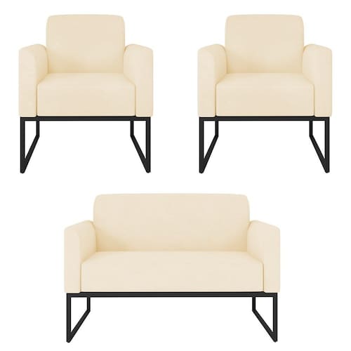 O momento em que decidimos mobiliar nossa casa é um evento muito especial, pois representa o que gostamos e o que irá refletir através dos móveis que irão compor cada espaço do nosso Lar.Cada escolha é uma oportunidade de imprimir o que sentimos, e para Sala de Estar desejamos conforto e beleza, para a hora de um bate-papo ou um belo café da tarde. O Kit Namoradeira e 2 Poltronas Decorativas Base Industrial Preta Maressa S03 Suede Bege - Ibiza pode transformar seu ambiente em algo único, sua estrutura em metal é firme e com fino acabamento, o estofado é macio e traz a leveza que o Estilo Industrial pode fazer em sua essência.Faça uma escolha inteligente e adquira conosco este Conjunto de Poltrona Namoradeira e Poltrona Decorativa, um toque de classe para o seu cantinho favorito.EspecificaçõesDimensões do Produto (Largura x Altura x Profundidade):Namoradeira: 113 x 76 x 64 cm.Poltronas: 65 x 77 x 64 cm.Peso: 46 kg.Outras MedidasProfundidade do assento: 46 cm.Largura do assento: 95 cm.Altura do assento ao chão: 44 cm.Altura do encosto: 35 cm.Altura Interna do Braço: 18 cm.Altura dos pés: 30 cm.Características do ProdutoMaterial da Estrutura: Madeira reflorestada de Eucalipto..Material da Espuma: Espuma D-28 no assento e encosto e D-23 nos braços..Peso Suportado: Até 480 Kg.Revestimento: Suede.Tipo de Encosto: Fixo.Tipo de Assento: Fixo.Quantidade de Lugares: 4 Lugares.Possui Pés: Sim.Material dos Pés: Base Industrial.Diferenciais:- Design moderno.- Percintas elásticas no assento.Sistema de Montagem: O produto é enviado montado, sendo necessário apenas fixar a base.Volumes: 4 Volumes.Conteúdo da Embalagem: 1 Namoradeira e 2 Poltronas Decorativas.Garantia do Fabricante: 90 dias contra defeito de fabricação.Montagem: Recomendamos que seja feita por um profissional.Recomendação de Limpeza: Utilize pano levemente úmido.Observações importantes:- Produto para uso residencial em ambiente interno, não devendo ficar exposto diretamente ao sol, calor e umidades excessivas.- Pode haver alguma diferença de tonalidade entre a imagem e o produto real, por conta do tratamento de imagens e a calibração de cores do seu monitor.- As imagens são meramente ilustrativas, não acompanham objetos de decoração e eletrônicos.- Confira o estado da embalagem, não devendo assinar o comprovante em caso de danos.- Não asseguramos, no ato da entrega, por subir escadas/elevadores, pelo transporte por guincho em apartamentos ou montagem, desmontagem e instalações. Eventuais despesas são por conta do comprador.- Confira as dimensões do produto e certifique-se de que passará normalmente por supostos elevadores, portas, escadas e/ou corredores de sua residência.