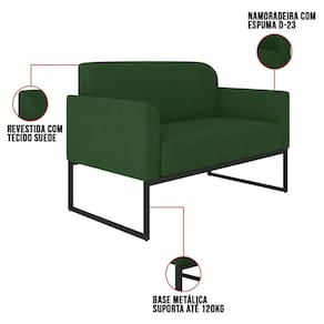 O momento em que decidimos mobiliar nossa casa é um evento muito especial, pois representa o que gostamos e o que irá refletir através dos móveis que irão compor cada espaço do nosso Lar.Cada escolha é uma oportunidade de imprimir o que sentimos, e para Sala de Estar desejamos conforto e beleza, para a hora de um bate-papo ou um belo café da tarde. O Kit Namoradeira e 2 Poltronas Decorativas Base Industrial Preta Maressa S23 Suede Verde - Ibiza pode transformar seu ambiente em algo único, sua estrutura em metal é firme e com fino acabamento, o estofado é macio e traz a leveza que o Estilo Industrial pode fazer em sua essência.Faça uma escolha inteligente e adquira conosco este Conjunto de Poltrona Namoradeira e Poltrona Decorativa, um toque de classe para o seu cantinho favorito.EspecificaçõesDimensões do Produto (Largura x Altura x Profundidade):Namoradeira: 113 x 76 x 64 cm.Poltronas: 65 x 77 x 64 cm.Peso: 46 kg.Outras MedidasProfundidade do assento: 46 cm.Largura do assento: 95 cm.Altura do assento ao chão: 44 cm.Altura do encosto: 35 cm.Altura Interna do Braço: 18 cm.Altura dos pés: 30 cm.Características do ProdutoMaterial da Estrutura: Madeira reflorestada de Eucalipto..Material da Espuma: Espuma D-28 no assento e encosto e D-23 nos braços..Peso Suportado: Até 480 Kg.Revestimento: Suede.Tipo de Encosto: Fixo.Tipo de Assento: Fixo.Quantidade de Lugares: 4 Lugares.Possui Pés: Sim.Material dos Pés: Base Industrial.Diferenciais:- Design moderno.- Percintas elásticas no assento.Sistema de Montagem: O produto é enviado montado, sendo necessário apenas fixar a base.Volumes: 4 Volumes.Conteúdo da Embalagem: 1 Namoradeira e 2 Poltronas Decorativas.Garantia do Fabricante: 90 dias contra defeito de fabricação.Montagem: Recomendamos que seja feita por um profissional.Recomendação de Limpeza: Utilize pano levemente úmido.Observações importantes:- Produto para uso residencial em ambiente interno, não devendo ficar exposto diretamente ao sol, calor e umidades excessivas.- Pode haver alguma diferença de tonalidade entre a imagem e o produto real, por conta do tratamento de imagens e a calibração de cores do seu monitor.- As imagens são meramente ilustrativas, não acompanham objetos de decoração e eletrônicos.- Confira o estado da embalagem, não devendo assinar o comprovante em caso de danos.- Não asseguramos, no ato da entrega, por subir escadas/elevadores, pelo transporte por guincho em apartamentos ou montagem, desmontagem e instalações. Eventuais despesas são por conta do comprador.- Confira as dimensões do produto e certifique-se de que passará normalmente por supostos elevadores, portas, escadas e/ou corredores de sua residência.