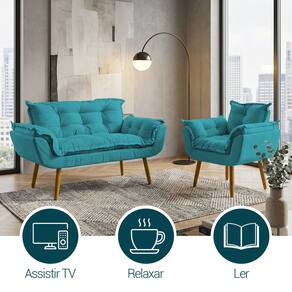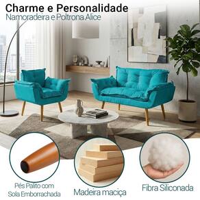 Kit Namoradeira e Poltrona Decorativa Para Sala Recepção Manicure Consultório Alice Tecido Suede - Azul Turquesa