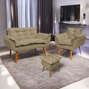 Fabricado com madeira maciça de eucalipto, o Kit Alice garante durabilidade e resistência. O assento e encosto possuem enchimento 100% em fibra siliconada, proporcionando maciez e conforto excepcionais. Revestido em tecido suede, oferece um toque macio e sofisticado. Seus pés, em madeira na tonalidade castanho, possuem design moderno e estável, trazendo charme e elegância ao ambiente. Com capacidade para até 120 kg na poltrona e namoradeira, e 100 kg no puff, é a escolha ideal para quem busca qualidade, conforto e estilo.