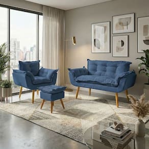 Fabricado com madeira maciça de eucalipto, o Kit Alice garante durabilidade e resistência. O assento e encosto possuem enchimento em fibra mista, proporcionando maciez e conforto excepcionais. Revestido em tecido suede, oferece um toque macio e sofisticado. Seus pés, em madeira na tonalidade castanho, possuem design moderno e estável, trazendo charme e elegância ao ambiente. Com capacidade para até 120 kg na poltrona e namoradeira, e 100 kg no puff, é a escolha ideal para quem busca qualidade, conforto e estilo.