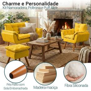 Fabricado com madeira maciça de eucalipto, o Kit Alice garante durabilidade e resistência. O assento e encosto possuem enchimento em fibra mista, proporcionando maciez e conforto excepcionais. Revestido em tecido suede, oferece um toque macio e sofisticado. Seus pés, em madeira na tonalidade castanho, possuem design moderno e estável, trazendo charme e elegância ao ambiente. Com capacidade para até 120 kg na poltrona e namoradeira, e 100 kg no puff, é a escolha ideal para quem busca qualidade, conforto e estilo.