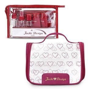 Ideal para viagens, academia, passeios ou para organizar produtos de beleza no dia a dia.Diferenciais:Design elegante com detalhes de coraçãoMaterial em PVC transparente e fácil de limparFechamento em zíper para segurança dos itensTag metálica com pin dourado Jacki DesignAmplo espaço interno para cosméticos e acessóriosMedidas: 24 cm (C) x 13 cm (P) x 15,5 cm (A)Cuidados: Limpe com pano úmido e sabão neutro; seque à sombra. Não deixar de molho, não usar produtos químicos e não lavar em máquina.Kit de Frascos para Viagem 10 PeçasO Kit de Frascos para Viagem Jacki Design é ideal para transportar líquidos, cremes e cosméticos com segurança e praticidade.