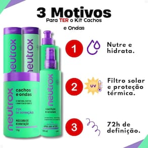 O Kit Neutrox Cachos e Ondas é perfeito para a rotina diária de cuidados capilares, seja para manter a saúde dos fios, definir os cachos após a lavagem ou revitalizá-los entre as lavagens. Ideal para quem busca praticidade e eficácia no tratamento de cabelos cacheados e ondulados, garantindo beleza e vitalidade em todas as ocasiões.