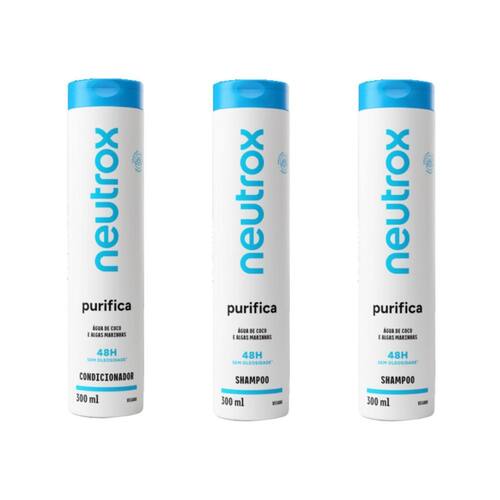 Kit neutrox purifica 1 condicionador 300ml + 2 shampoo 300ml Descrição O kit neutrox purifica 1 condicionador 300ml + 2 shampoos 300ml é a solução perfeita para quem busca cabelos limpos, purificados e com uma sensação de frescor prolongada. O shampoo 300ml oferece uma limpeza profunda, removendo resíduos e impurezas sem agredir os fios, enquanto o condicionador 300ml hidrata e suaviza, deixando os cabelos mais leves, macios e com brilho natural. Formulado com ingredientes especiais, este kit proporciona cuidados diários para cabelos saudáveis, renovados e livres de acúmulo de produtos, garantindo uma sensação de limpeza e frescor duradoura. Modo de uso Shampoo neutrox purifica 300ml Aplique o shampoo nos cabelos molhados, massageando suavemente até formar espuma. Enxágue bem e, se necessário, repita o processo. Condicionador neutrox purifica 300ml Após lavar os cabelos com o shampoo, aplique o condicionador nos cabelos úmidos, distribuindo uniformemente do comprimento às pontas. Deixe agir por 2 a 3 minutos e enxágue bem. Para um resultado ainda mais eficaz, use o kit regularmente. Marca: Não Informado