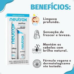 Descubra o poder da purificação para seus cabelos com o Kit Neutrox Purifica. Este kit completo, composto por Shampoo 300ml e Condicionador 200ml, foi desenvolvido pela Neutrox para proporcionar uma limpeza profunda e eficaz. Ideal para quem busca remover impurezas e resíduos, deixando os fios leves, frescos e com uma sensação de bem-estar renovada.