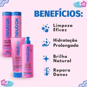 Prepare-se para desfrutar do verão e de momentos de lazer sem preocupações com a saúde dos seus cabelos com o Kit Neutrox Sol, Mar e Piscina. Desenvolvido pela renomada marca Neutrox, este kit completo oferece uma solução eficaz para proteger e restaurar seus fios dos danos causados pela exposição ao sol, sal do mar e cloro da piscina. Tenha cabelos sempre hidratados, macios e brilhantes, prontos para qualquer aventura.