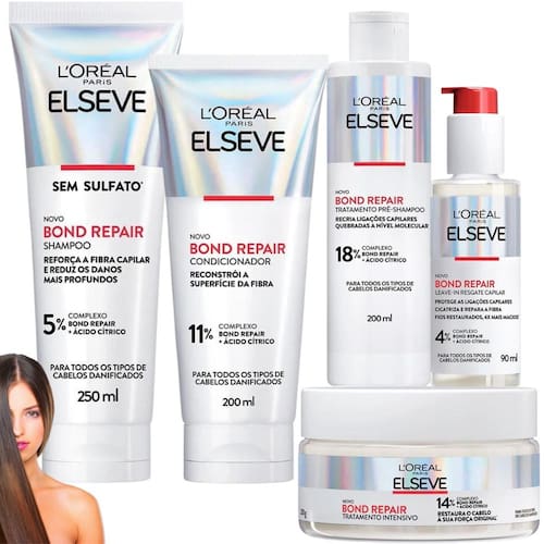 1 Bond Repair Shampoo Loreal Paris Elseve - 250ml 1 Bond Repair Condicionador Loreal Paris Elseve - 200ml 1 Bond Repair Tratamento Pré Shampoo Loreal Paris Elseve - 200ml 1 Bond Repair Tratamento Intensivo Loreal Paris Elseve - 200g 1 Bond Repair Leave-In Resgate Capilar Loreal Paris Elseve - 90ml