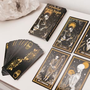 O Kit com Taro Negro 22 cartas + Toalha Crânioda Bialluz, nos ajuda a encontrar respostas e sinalizações que nos direcionarão para o autoconhecimento e melhor compreensão de nossa realidade.Em momentos que estamos confusos e nos sentindo limitados, este tarot revela, através das cartas, os pontos e as questões que trazem maior clareza da situação. Para ler o tarot negro com o método das três cartas você deve embaralhar as 22 cartas.Após o baralho deve ser cortado em três montes iguais, utilizando-se a mão esquerda. As cartas de cima de cada monte deverão ser viradas e lidas da esquerda para a direita, com pausa para interpretação e reflexão de cada uma.