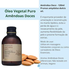 O óleo Vegetal de Amêndoa Doce Via Aroma evita o ressecamento e é um excelente regenerador para pele. Ideal para ser usado como carreador de óleos essenciais em massagens, uso facial ou capilar. Possui alto teor de ômega 9, vitamina A e E. Previne estrias e é indicado para irritação, coceiras, queimaduras e casos de fragilidade das unhas.