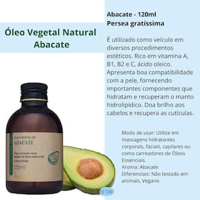O óleo vegetal de Abacate Via Aroma possui alto poder de nutrição e é rico em vitamina E, A e D. hidratante, antioxidante e cicatrizante. Ele ajuda a reduzir marcas de expressão, acelera a cicatrização e deixa a pele nutrida, macia e flexível. Ideal para ser usado como carreador de óleos essenciais em massagens, uso facial ou capilar.
