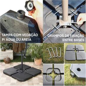 O Ombrelone vem com um pé cruzado. Deve ser fixado fixo com parafusos ao piso ou então sustentado com uma base pesada que pode ser placas de pedra, concreto ou então a solução mais prática que são as bases plásticas com preenchimento por água ou areia (disponível separadamente).