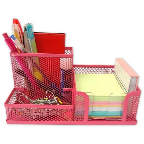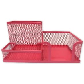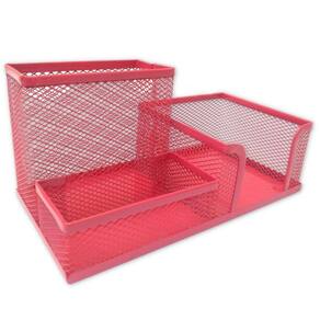 Características: - Modelo: Kit organizador de mesa escritório - Cor: Rosa - Material: Metal - Tipo: Porta Caneta, Porta Clips e Porta Bloco de Notas - Tamanho:20x10x10cm LxAxC - Peso: 250gr