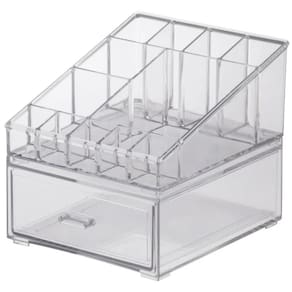 DESCRIÇÃO DO PRODUTO Kit Organizador Cosméticos 12,5x11,5x12cm - Paramount - Com o Organizador de Cosméticos sua bancada ficará organizada e seus produtos de beleza sempre a mãos. Contém 1 gaveta com tamanho ideal para paletas de sombra ou blush, 3 divisórias para batons ou esmalte e mais 4 divisórias para pincéis, demaquilantes, bases e o que mais você quiser. Confeccionado em material resistente e transparente ele é o guardião perfeito para as suas joias. Material: Plástico Dimensões: 12,5 x 11,5 x 12 cm Ean: 7898943566331