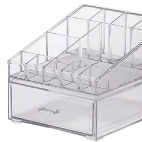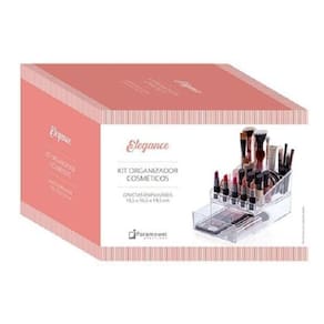 - Com o Organizador de Cosméticos sua bancada ficará organizada e seus produtos de beleza sempre a mãos. Contém 1 gaveta com tamanho ideal para paletas de sombra ou blush, 5 divisórias para batons ou esmalte e mais 7 divisórias para pincéis, demaquilantes, bases e o que mais você quiser. Confeccionado em material resistente e transparente ele é o guardião perfeito para as suas joias.