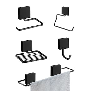 - Saboneteira adesiva (1 unidade); - Suporte para toalha de banho (1 unidade); - Suporte para toalha de rosto (1 unidade); - Suporte para papel higiênico (1 unidade); - Gancho multiuso(1 unidade).