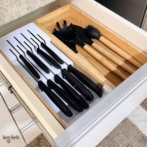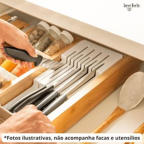 ASPEN DECOR F6228 Conjunto Organizador de gavetas que vai elevar o nível da organização na sua casa.O Organizador de Facas garante organização e cuidado para o seu dia a dia. Permite acomodar as facas de forma segura, garantindo a durabilidade do fio. Possibilita o máximo aproveitamento de espaço nas gavetas. Já o Organizador de Gavetas com seu design modular possibilita diversas composições, pode ser utilizado para acomodar utensílios, panos de prato e muito mais. Possui versatilidade para organizar toda a casa, desde a cozinha aos armários do quarto. O bambu promove a sustentabilidade de um material 100% renovável, e traz sofisticação para decorar a sua casa. Conteúdo da Embalagem: 1 Organizador de Facas e 1 Caixa Organizadora retangular Especificações Técnicas: Medidas: Porta Facas: 38,4cm C x 15,7cm L x 5,7cm A ; Capacidade : 5 Facas Grandes e 4 Facas Pequenas Caixa Organizadora de Gaveta: 38,4cm C x 15,7cm L x 5,7cm A ; Capacidade : Serve para utensílios para panos de prato, permite várias composições.