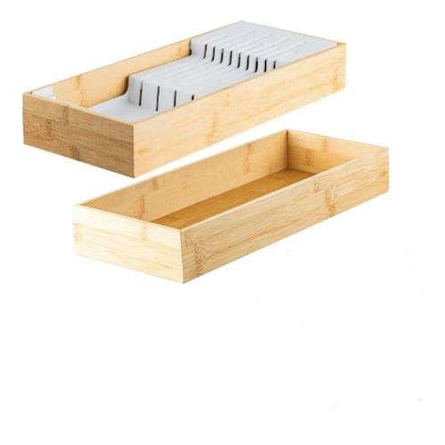 ASPEN DECOR F6228 Conjunto Organizador de gavetas que vai elevar o nível da organização na sua casa.O Organizador de Facas garante organização e cuidado para o seu dia a dia. Permite acomodar as facas de forma segura, garantindo a durabilidade do fio. Possibilita o máximo aproveitamento de espaço nas gavetas. Já o Organizador de Gavetas com seu design modular possibilita diversas composições, pode ser utilizado para acomodar utensílios, panos de prato e muito mais. Possui versatilidade para organizar toda a casa, desde a cozinha aos armários do quarto. O bambu promove a sustentabilidade de um material 100% renovável, e traz sofisticação para decorar a sua casa. Conteúdo da Embalagem: 1 Organizador de Facas e 1 Caixa Organizadora retangular Especificações Técnicas: Medidas: Porta Facas: 38,4cm C x 15,7cm L x 5,7cm A ; Capacidade : 5 Facas Grandes e 4 Facas Pequenas Caixa Organizadora de Gaveta: 38,4cm C x 15,7cm L x 5,7cm A ; Capacidade : Serve para utensílios para panos de prato, permite várias composições.