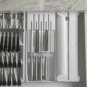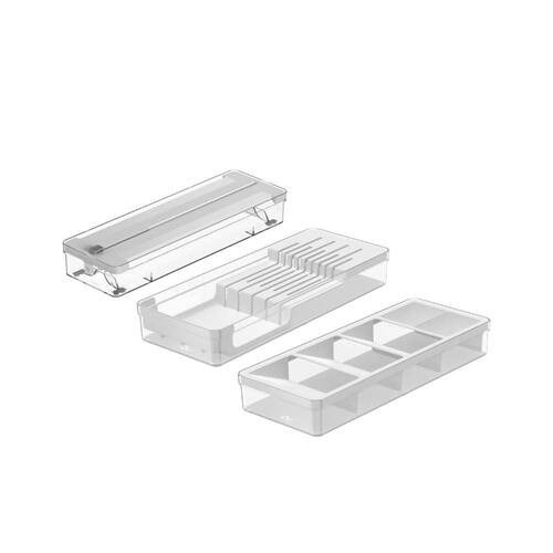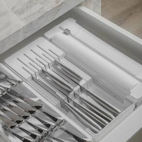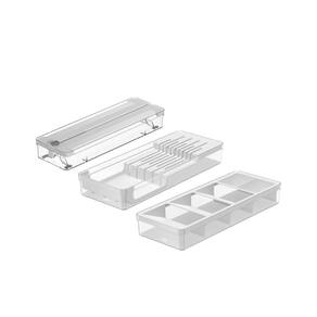 Este kit é perfeito para organizar e otimizar o espaço das suas gavetas. O primeiro item, Cortador e Organizador de rolos, foi pensado para armazenar rolos de plástico filme, papel alumínio e papel manteiga e acomoda dois rolos de 15 a 30 metros e até 30 cm de comprimento, garantindo que tudo fique no lugar. Proporciona mais praticidade para a rotina na cozinha pois mantêm os rolos sempre prontos para uso, com um corte perfeito a cada utilização. As ventosas na base estabilizam o organizador, seja dentro da gaveta ou sobre a bancada. Para trocar os rolos basta abrir a tampa com os botões laterais, inserir os rolos e fechar.O segundo item, comporta 9 facas sendo 5 facas grandes e 4 facas pequenas. Além de divisórias que preservam o fio das facas, proporciona segurança para você e sua família, sem o risco de alguém se machucar procurando pela faca ideal na gaveta.O terceiro item completa uma perfeita combinação para a gaveta, pois traz 5 opções para organização dos talheres.Combine, encaixe, visualize e acesse facilmente o conteúdo, mantendo tudo em ordem. Produzido em material resistente e de alta transparência, esses organizadores são práticos e fáceis para higienizar.A linha Clear é indispensável para auxiliar você na organização da sua casa.INFORMAÇÕES TÉCNICASDimensões: LxAxP: 15x6x38 cm.Material: PS (Poliestireno)Cor: BrancoCUIDADOSSugere-se higienizar com sabão neutro e esponja macia, evitando produtos abrasivos no processo de limpeza. Não é recomendado colocar o material na lava-louças.CONTEÚDO DA EMBALAGEM 1 Organizador de Facas Clear 37,5 x 15 x 5,6 cm1 Organizador de talheres Clear 37,5 x 15 x 5,6 cm1 Organizador e cortador de rolos duplo Ou Clear GavetasSOBRE NÓSSomos apaixonados pelo que fazemos e utilizamos o design como meio de fazer você se sentir em casa onde estiver.Criamos produtos com carinho e cuidado para atender as suas necessidades diárias, levando bem-estar, aconchego e conforto para seu lar.Somos minimalistas e funcionais pois queremos que você tenha um estilo de vida mais leve e organizado, para atingir o máximo do seu potencial.Prazer, somos Ou.