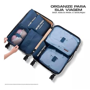 O que está incluído no kit 3 Cubos Organizadores P, M e G : Ideais para roupas, acessórios e outros itens volumosos. 3 Necessaires/Sacos P, M e G : Perfeitos para itens menores ou peças molhadas.