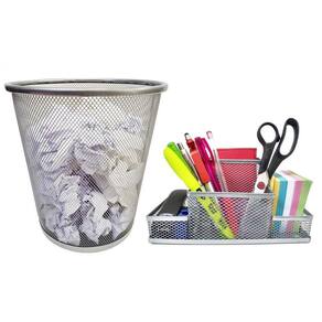Kit escritório composto por: - 01 organizador de mesa escritório com 4 partições - 01 lixeira aramada