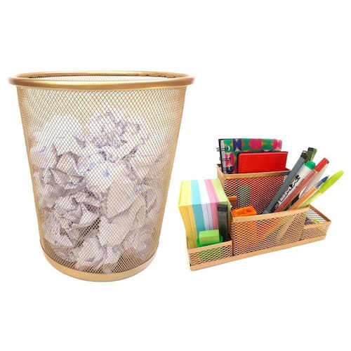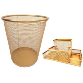 Kit organizador de mesa e lixeira dourado escritório Kit escritório dourado ouro com 2 unidades Para quem gosta de ter tudo sempre à mão, com agilidade e praticidade. Kit organizador de mesa e a lixeira de escritório é ideal para você.Com eles, você vai evitar a perda de tempo procurando os itens de que precisa e que usa com frequência. Tudo estará a sua mão. O organizador de mesa de escritório tem 4 partes com tamanhos variados. permitindo organiza canetas, lápis, clips, bloco de notas e pequenos objetos. Kit escritório dourado ouro composto por:- 01 organizador de mesa escritório dourado ouro com 4 partições - 01 lixeira aramada dourado ouro Cor: dourado ouro Material: metal - organizador de mesa escritório tamanho: 20x10x10cm largura x altura x comprimento - lixeira tamanho: 27x23,5x18,5cm altura x diâmetro da boca x diâmetro da base Marca: Markys Store
