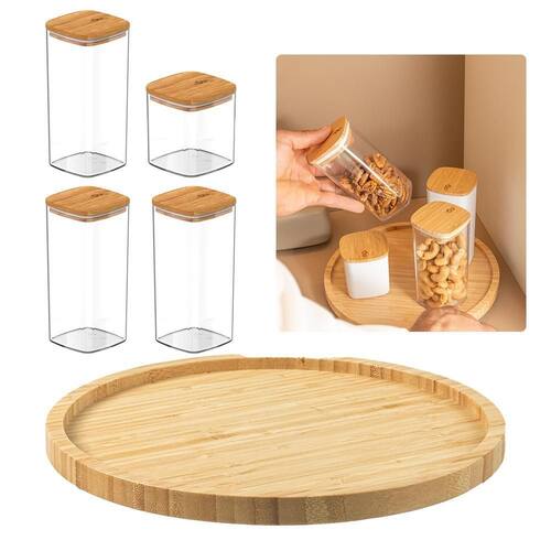ASPEN DECOR F6317 Kit Organizador Giratório + 4 Potes Herméticos Keep 150ml e 340ml O Kit Organizador Giratório com Potes Herméticos Keep da Aspen Decor proporciona praticidade e organização para a sua cozinha. O organizador giratório de 360 em bambu permite acesso fácil aos itens e torna o ambiente mais sofisticado e funcional. Os potes herméticos, com capacidades de 150ml e 340ml, possuem tampa de bambu com vedação que bloqueia a entrada de ar, garantindo frescor e proteção para seus temperos e alimentos. Feitos com materiais duráveis e sustentáveis, esses produtos aliam beleza e funcionalidade, promovendo mais tranquilidade e bem-estar na sua rotina. Conteúdo do Kit: 01 Organizador Giratório Multiuso em Bambu 25 x 2,5 cm : Design 360 para fácil acesso aos itens, ideal para temperos, condimentos ou outros utensílios de cozinha. 01 Pote Hermético Keep de 150ml: Design compacto, ideal para temperos; bloqueia a luz e preserva o frescor. Dimensões: 6,5 x 6,5 x 7 cm. 03 Potes Herméticos Keep de 340ml: Capacidade maior para armazenamento de alimentos, com vedação hermética e design modular. Dimensões: 6,5 x 6,5 x 13,5 cm. Destaques do Kit: Organização Completa: Kit que inclui armazenamento modular e organizador giratório para um ambiente de cozinha otimizado. Sustentabilidade e Elegância: Produtos em bambu, um material 100% renovável, trazendo um toque natural à decoração. Vedação Hermética nos Potes: Prolonga a frescura dos alimentos ao bloquear a entrada de ar e proteger contra a luz. Funcionalidade e Praticidade: Organizador giratório para acesso rápido e potes resistentes, fáceis de limpar e organizar. Transforme o ambiente e valorize a conservação de alimentos com o Kit Organizador Giratório + Potes Herméticos da Aspen Decor Aviso Importante: As cores dos produtos podem apresentar variações em relação às imagens exibidas devido à calibração do monitor ou smartphone. Atenção: Os objetos que ambientam as fotos não acompanham o produto. Imagens meramente ilustrativas. Observação: Confira as dimensões do produto no momento da compra As medidas estão detalhadas na descrição para garantir que ele seja exatamente o que você procura. Marca: Não Informado