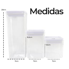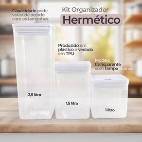 Feito para quem busca mais organização na cozinha, nosso kit de organizadores herméticos será a solução ideal! Seu design conta com 3 tamanhos e capacidades diferentes, os organizadores são perfeitos para todas as suas necessidades, podendo guardar diversos tipos de alimentos com facilidade, possuindo uma abertura com alavanca, além da vedação hermética e possibilidade de empilha-los. Protegendo contra umidade, poeira e inseto, os organizadores mantêm os alimentos frescos e intactos em casa ou qualquer lugar que deixe.Feito com materiais de alta qualidade, eles são fáceis de limpar e oferecem resistência para o uso contínuo, além disso, a sua transparência facilita a visualização do conteúdo e seu design empilhável economiza ainda mais espaço. ESPECIFICAÇÕES:Material: Peças em Plástico Injetado PP e PSC, Vedação em TPUDimensões:-Organizador Pequeno: Alt.: 11,5cm x Larg.: 11cm-Organizador Médio: Alt.: 16,5cm x Larg.: 11cm -Organizador Grande: Alt.: 28cm x Larg.: 11cmPeso: Aprox. 730gCapacidade:-Pequeno: 1 Litro-Médio: 1,5 Litros-Grande: 2,5 LitrosCor: Transparente com Tampa Branca CONTÉM:01 KIT COM 3 ORGANIZADORES HERMÉTICOS 5 LITROS - BRANCOFeito para quem busca mais organização na cozinha, nosso kit de organizadores herméticos será a solução ideal! Seu design conta com 3 tamanhos e capacidades diferentes, os organizadores são perfeitos para todas as suas necessidades, podendo guardar diversos tipos de alimentos com facilidade, possuindo uma abertura com alavanca, além da vedação hermética e possibilidade de empilha-los. Protegendo contra umidade, poeira e inseto, os organizadores mantêm os alimentos frescos e intactos em casa ou qualquer lugar que deixe.Feito com materiais de alta qualidade, eles são fáceis de limpar e oferecem resistência para o uso contínuo, além disso, a sua transparência facilita a visualização do conteúdo e seu design empilhável economiza ainda mais espaço. ESPECIFICAÇÕES:Material: Peças em Plástico Injetado PP e PSC, Vedação em TPUDimensões:-Organizador Pequeno: Alt.: 11,5cm x Larg.: 11cm-Organizador Médio: Alt.: 16,5cm x Larg.: 11cm -Organizador Grande: Alt.: 28cm x Larg.: 11cmPeso: Aprox. 730gCapacidade:-Pequeno: 1 Litro-Médio: 1,5 Litros-Grande: 2,5 LitrosCor: Transparente com Tampa Branca CONTÉM:01 KIT COM 3 ORGANIZADORES HERMÉTICOS 5 LITROS - BRANCO