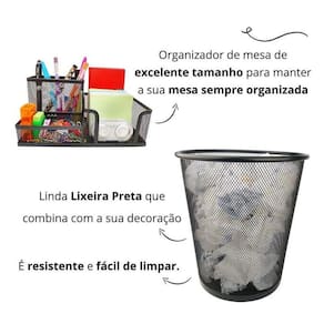 Kit organizador de mesa escritório e lixeira aramada home office preto Kit escritório com 4 unidades Para quem gosta de ter tudo sempre à mão, com agilidade e praticidade. O kit de organizador de mesa e a lixeira de escritório é ideal para você.Com eles, você vai evitar a perda de tempo procurando os itens de que precisa e que usa com frequência. Tudo estará a sua mão. O organizador de mesa de escritório tem 3 partições com tamanhos variados. Permitindo organiza canetas, lápis, clips, bloco de notas e pequenos objetos. Kit escritório composto por:- 02 organizadores de mesa escritório com 3 partições- 02 lixeiras aramada Material: metal - organizador de mesa escritórioTamanho: 20x10x10cm largura x altura x comprimento - lixeiraTamanho: 27x23,5x18,5cm altura x diâmetro da boca x diâmetro da base Marca: Markys Store