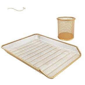 Especificações Técnicas: - Material: Metal - Cor: Dourado Ouro - Bandeja: - Tamanho: 4x27,5x35cm altura x largura x comprimento - Peso: 300g - Prateleiras adicionais - Não necessita de montagem - Porta Caneta Lápis: - Tamanho: 9x10cm diâmetro x altura - Peso: 100g