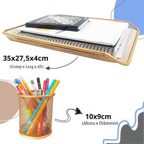 Especificações Técnicas: - Material: Metal - Cor: Dourado Ouro - Bandeja: - Tamanho: 4x27,5x35cm altura x largura x comprimento - Peso: 300g - Prateleiras adicionais - Não necessita de montagem - Porta Caneta Lápis: - Tamanho: 9x10cm diâmetro x altura - Peso: 100g