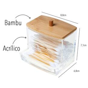 - Material: Acrílico resistente e tampa de bambu natural - Tamanho: Porta cotonete: 8,8cm x 7cm x 7,2cm | Porta algodão: 8,9cm x 6,5cm - Design: Moderno e elegante - Funcionalidade: Organiza e decora seu banheiro - Durabilidade: Feito para durar Marca: Brush Sets Ean: 7894017024684