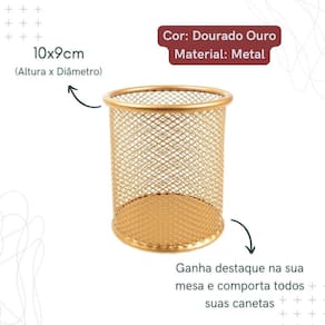 Kit escritório dourado ouro composto por: - 01 organizador de mesa escritório dourado ouro com 4 partições - 01 porta caneta, lápis dourado ouro - 01 lixeira aramada dourado ouro