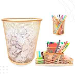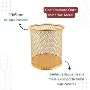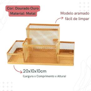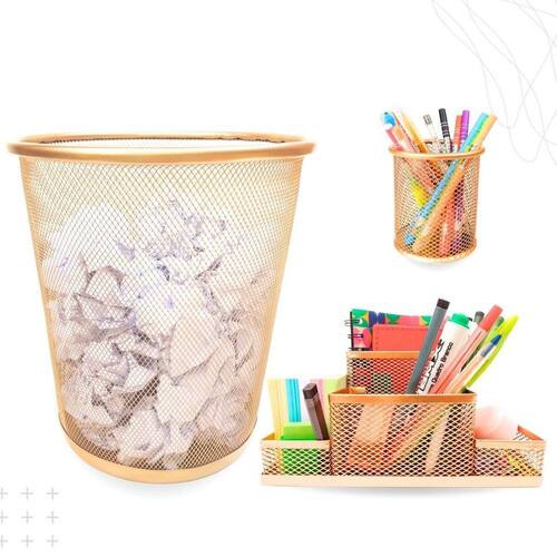 Kit escritório dourado ouro composto por: - 01 organizador de mesa escritório dourado ouro com 4 partições - 01 porta caneta, lápis dourado ouro - 01 lixeira aramada dourado ouro