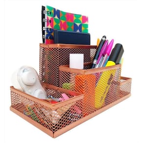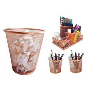 Kit organizador, porta caneta e lixeira rose gold escritório Kit escritório rose gold com 4 peças Para quem gosta de ter tudo sempre à mão, com agilidade e praticidade. Kit completo de organizador, porta canetas e lixeira de escritório é ideal para você. Com eles, você vai evitar a perda de tempo procurando os itens de que precisa e que usa com frequência. Tudo estará a sua mão. O organizador de mesa de escritório tem 4 partes com tamanhos variados. permitindo organiza canetas, lápis, clips, bloco de notas e pequenos objetos. Kit escritório rose gold composto por:- 01 organizador de mesa escritório rose gold com 4 partições - 02 porta caneta, lápis rose gold - 01 lixeira aramada rose gold Cor: Rose gold Material: Metal - organizador de mesa escritório tamanho: 20x10x10cm largura x altura x comprimento - porta caneta, lápis tamanho: 10x9cm altura x diâmetro - lixeira tamanho: 27x23,5x18,5cm altura x diâmetro da boca x diâmetro da base Marca: Markys Store