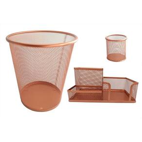 Kit escritório rose gold composto por: - 01 organizador de mesa escritório rose gold com 3 partições - 01 porta caneta, lápis rose gold - 01 lixeira aramada rose gold