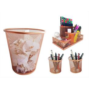 Kit escritório rose gold composto por: - 01 organizador de mesa escritório rose gold com 4 partições - 02 porta caneta, lápis rose gold - 01 lixeira aramada rose gold