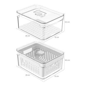 Kit Organizadores De Geladeira 2,2l Frutas E Legumes 3 Pçs Cor: Transparente MAPLE DECOR F6019 DESCRIÇÃO Com o organizador de geladeira Clear Fresh, você terá organização e irá conservar e manter o frescor de seus alimentos por mais tempo, a tampa com ventilação ajustável mantém o nível de umidade ideal para cada tipo de alimento, mantendo-os frescos por mais tempo. Possui cesto que auxilia na lavagem e impede que a umidade acumulada se mantenha no alimento, evitando o murchamento e deterioração. Kit 3 Organizadores De Geladeira 2,2L Conteúdo: - 02 Organizador com bandeja de drenagem; - 01 Organizador com cesto de drenagem; Dimensões dos organizadores: 20cm C x 15cm L x 9,5cm A Capacidade dos organizadores: 2,2 Litros. Organize Frutas, Verduras, Legumes e Hortaliças. Organizadores de geladeira transparentes Porta frios modular e empilhável Linha Clear Fresh OU Ventilação e Humidade controlada Organização e otimização de espaço Com Cesto Removível Drenagem Detalhes dos produtos: - Os organizadores possuem cesto e bandeja de drenagem que evitam que os alimentos fiquem molhados após a lavagem, ajudando a prevenir a deterioração precoce; - As tampas com respiradouros dos organizadores mantém o nível de umidade ideal para cada tipo de alimento, mantendo-os frescos por mais tempo; - O cesto de drenagem dispõe de alças laterais que facilitam o transporte e manuseio; - Possuem total transparência para você enxergar o conteúdo e manter tudo em ordem; - Não suportam micro-ondas; - Livres de bisphenol A; - Não suportam freezer; - Suportam geladeira; - Empilháveis. Materiais: - Polipropileno PP ; - Poliestireno PS .